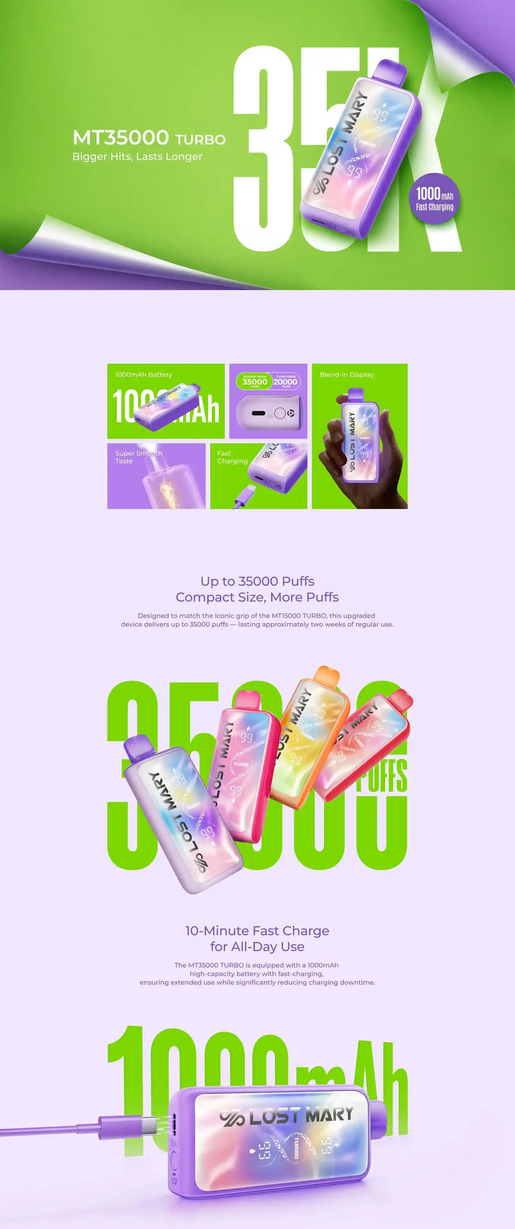 18mL prefilled capacity, 1000mAh battery, up to 35K puffs, long-lasting & fresh.